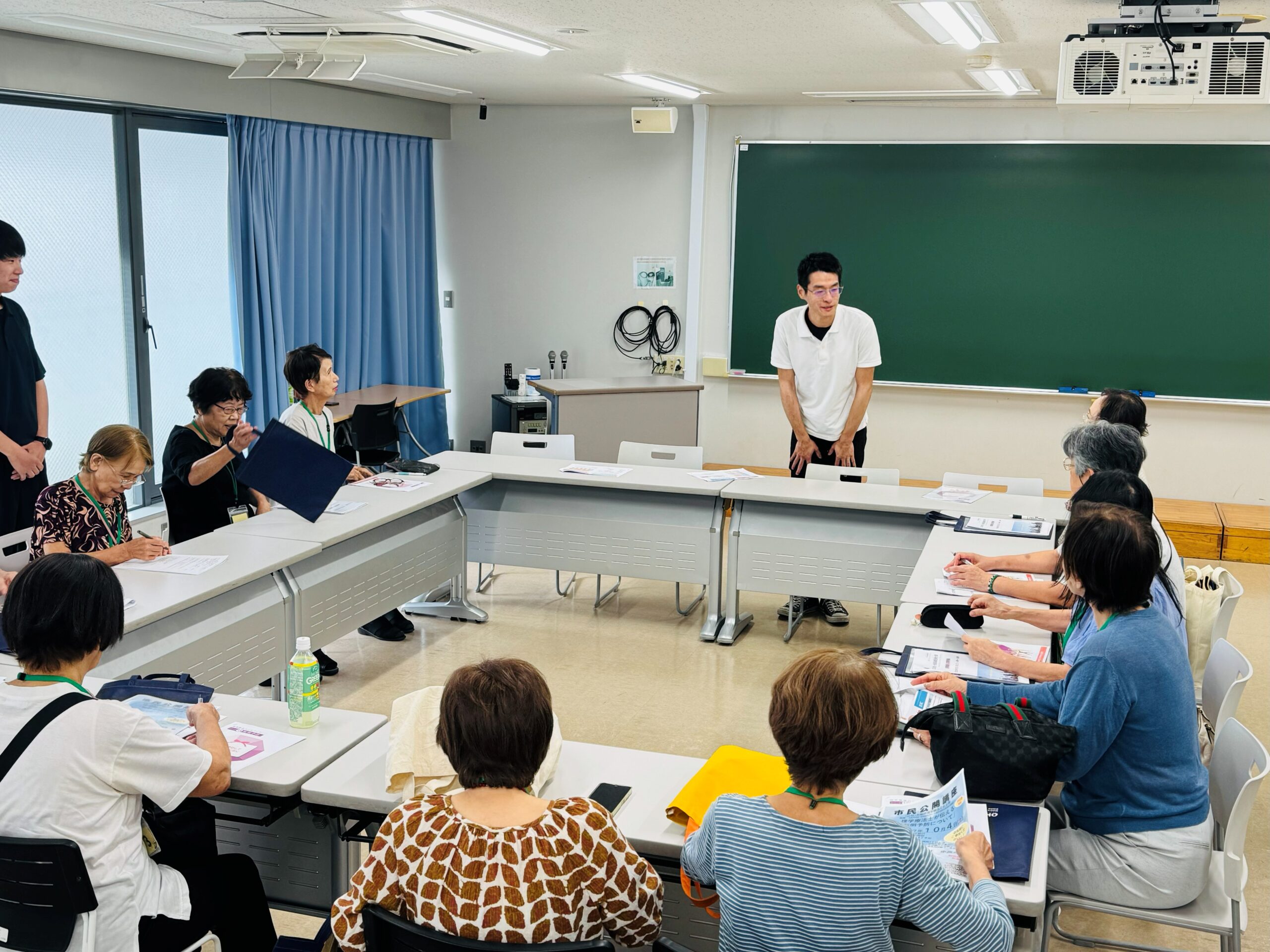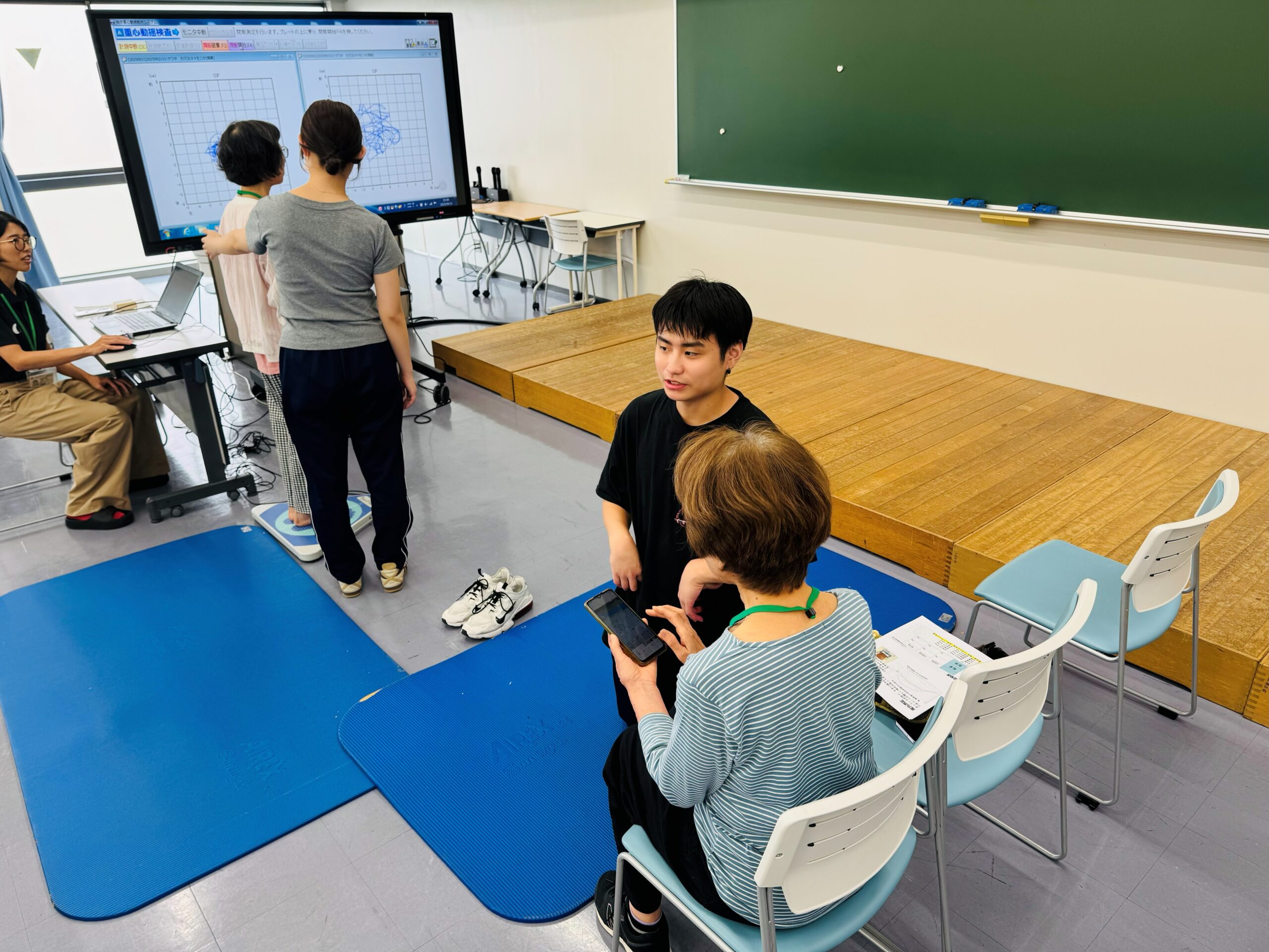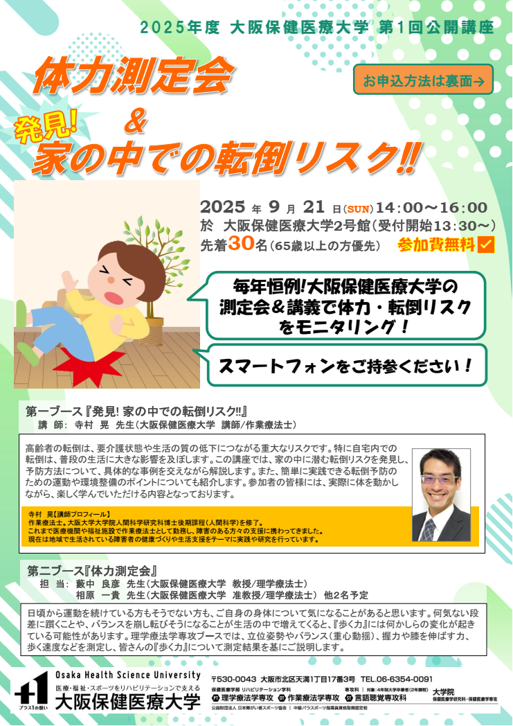 NEWS 公開講座 2025.10.23 9月21日(日)に2025年度大阪保健医療大学第1回公開講座を実施しました。 9月21日(日)に2025年度大阪保健医療大学第1回公開講座を実施しました。 「体力測定会&発見!家の中での転倒リスク‼」というテーマで実施しました。近隣21名の住民の方にご参加いただきました。 「発見!家の中での転倒リスク‼」では、寺村晃先生(大阪保健医療大学講師 作業療法士)が当大学学生と一緒に、家の中に潜む転倒リスクを発見し転倒を予防する方法について、具体的な事例を紹介しながら解説を行いました。また、簡単に実践できる転倒予防体操や転倒しないための家の中の整理のポイントを紹介しました。参加者の皆様からは、「躓きが転倒に進んでいくことが分かりました。」、「転倒予防トレーニングをやっていこうと思います。」、「転倒して骨折をしないように気をつけます。」などとても肯定的な感想を頂きました。 講堂を使った「体力測定会」では、大阪保健医療大学理学療法法学専攻の教員と学生が、姿勢、バランス、歩く速度、膝を伸ばす筋肉の筋力、握力の測定を行いました。昨年の測定会の記録用紙を持参された参加者の方もおられ、昨年の測定結果と比べて一喜一憂しておられました。昨年の測定会以降、姿勢や運動を意識してしっかりと体を起こして座ることや運動を実践されて、昨年よりも良い結果の方もたくさんいらっしゃいました。参加者の方からは、「立つときの姿勢など前傾で日常生活で気を付けることを教わり、ありがとうございました。」、「説明が丁寧で分かりやすかった。」、「優しく丁寧で楽しかった。学生さん笑顔で接して頂き、ありがとうございました。」、「毎年楽しみに待っています。」と好評を頂きました。 機器を使ったバランス能力の測定です。 転倒しないためにとても重要な膝を伸ばす筋肉の筋力を測定しています。 全身の運動機能や転倒のしやすさに関係している歩行速度を測定しています。 定期的に転倒予防や認知症予防等についてお伝えすると共に、運動機能をモニターして自己管理していただくことが健康で長生きしていただくために有効だと考えますので、今後も引き続き大阪保健医療大学の地域貢献の一環として、体力測定会や転倒予防などの公開講座を実施していきたいと考えています。 大阪保健医療大学 公開講座委員会委員長 藪中良彦