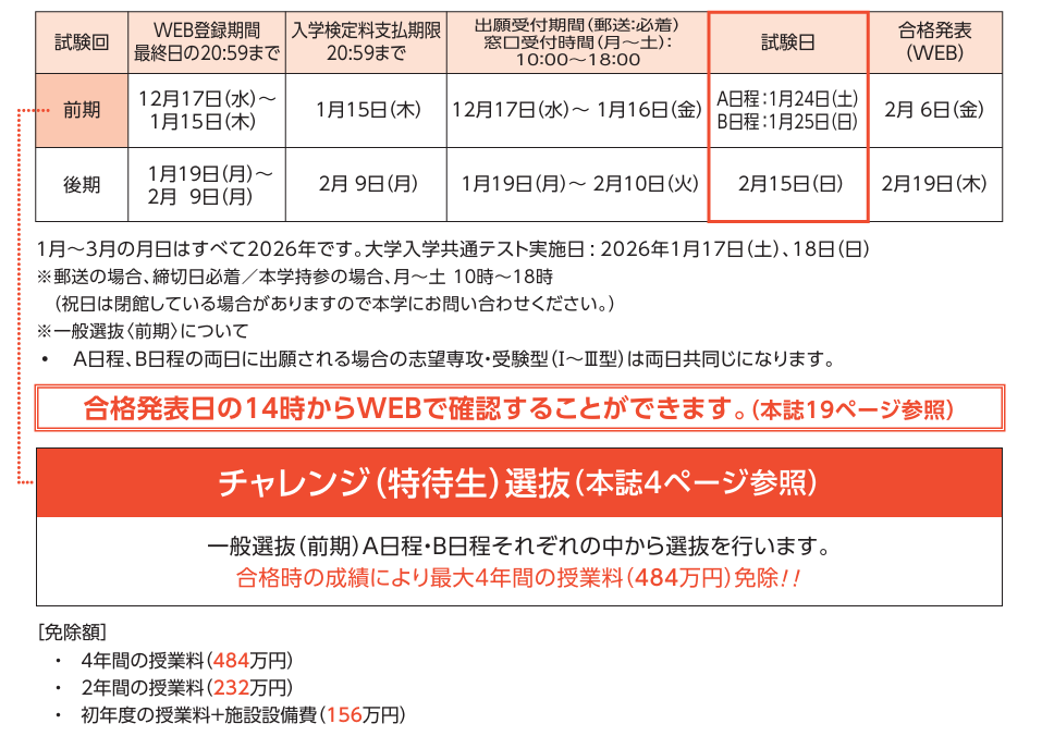 入試情報 2025.12.08 12/17(水)より2026年度 「一般選抜〈前期〉/チャレンジ(特待生)選抜〈後期〉」のWEB登録を開始します 12/17(水)より「一般選抜〈前期〉/チャレンジ(特待生)選抜〈後期〉」のWEB登録を開始します。 一般選抜とは、一般選抜は得意科目を活かせる入学試験制度です。「知識・技能」を重視して評価します。 ● 一般選抜〈前期〉は、A日程・B日程を選択できます。あるいは両日受験することも可能です。 ● 一般選抜〈前期〉の受験者の中からチャレンジ(特待生)選抜を、A日程・B日程それぞれで行います。 チャレンジ(特待生)選抜とは、選抜向学心に富みながら経済的理由により修学が困難な方、学力優秀かつ他の学生の模範となるであろう方、理学療法士・作業療法士への就業意欲が高い方などを積極的に支援するために、特に出願資格を設けず、多くの受験者にチャレンジして頂くための入試制度です。 ● 既に総合型選抜、学校推薦型選抜(公募制推薦・指定校推薦)、社会人選抜で受験し、第一志望専攻で合格した方は、合格の権利を保持したまま出願できます。 ※出願の際は再度出願書類の提出が必要です。 最大で、4年間の授業料免除になります! 入学試験日程 試験科目 一般選抜の詳細は募集要項 一般選抜ページをご覧ください。 チャレンジ(特待生)選抜の詳細は募集要項 チャレンジ(特待生)選抜ページをご覧ください。 募集要項は「資料請求」ページよりご請求いただくか、「学生募集要項」ページをご確認ください。 ■WEB出願サイトはコチラ ご不明な点等ございましたら、フリーダイヤル(0120-581-834)までご連絡ください。