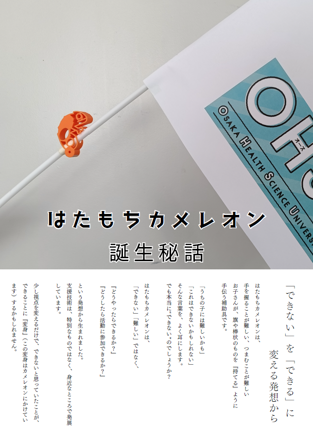 NEWS 2025.12.24 学校法人福田学園から新たな自助具が誕生!【大阪保健医療大学・大阪リハビリテーション専門学校 共同開発】子どもの「できた」を支える自助具「はたもちカメレオン」 学校法人福田学園(大阪保健医療大学・大阪リハビリテーション専門学校)は、子どもの活動参加を支える新たな自助具「はたもちカメレオン」を開発しました。 本学園内で専門性を持つ教職員が連携し、現場のニーズから生まれた実践的な支援ツールです。 今回の開発には、大阪保健医療大学 言語聴覚専攻科の川畑 武義 助教(言語聴覚士)、大阪リハビリテーション専門学校 作業療法学科の打田 明 教員(作業療法士)、そして事務局の嶋崎職員の三名が連携し、制作に取り組みました。 「はたもちカメレオン」は、手を握る・つまむといった動作が難しいお子さんが、旗や棒状の道具を“自分の力で持つ”体験をサポートする補助具です。行事や遊びなど、子どもが主体的に参加する場面で、「持つ」という行為を可能にする工夫が施されています。 手に麻痺や障害のあるお子さんの活動場面で実際に使っていただき、活動参加を広げる支援ツールとして高い期待が寄せられています。本学園が大切にしてきた「教育・研究・実践の連携」が形となった成果の一つです。 ✅はたもちカメレオン 誕生秘話🦎 ——————— 〜「できない」を「できる」に変える発想から〜 はたもちカメレオンは、 手を握ることが難しい、つまむことが難しいお子さんが、 旗や棒状のものを『持てる』ように手伝う補助具です。 「うちの子には難しいかも」 「これはできないかもしれない」 そんな言葉を、よく耳にします。 でも本当に“できない”のでしょうか? はたもちカメレオンは、「できない」「難しい」ではなく、 『どうやったらできるか?』 『どうしたら活動に参加できるか?』 という発想から生まれました。 支援技術は、特別なものではなく、身近なところで発展しています。 少し視点を変えるだけで、できないと思っていたことが、できることに『変身』するかもしれません。 ——————— 活動に参加することは、単に動作ができるかどうかではなく、その人がその場に関わることそのものを意味します。 はたもちカメレオンは、そうした参加の可能性を広げるための一つの工夫です。 ✅取り組みの意義 本取り組みは、言語聴覚士・作業療法士・事務局職員という異なる専門性を持つ三名が協働することで実現しました。専門職としての知見に加え、現場の声を丁寧に拾い上げ、支援のあり方を共に考える姿勢は、学校法人福田学園が教育・実践の両面で大切にしている価値そのものです。 本学園では、こうした実践的な開発に携わる機会を通じて、学生が「現場で求められる力」を学ぶ環境づくりを進めています。本学園は今後も、教育・研究・実践を通じて、地域や社会に必要とされる支援の形を創造し続けます。